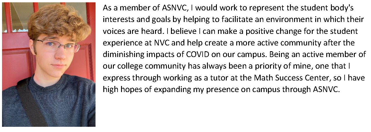 to study here for another year. Going into my third year I want to help nurture the community that I am a part of and bring the student body together. When elected into ASNVC, I will ensure that I am a voice for the needs and wants of the students. I will work with my peers to celebrate the diversity of our campus, create positive change, and foster connections that enrich our college experience and our lives beyond.